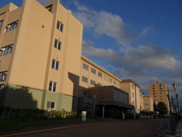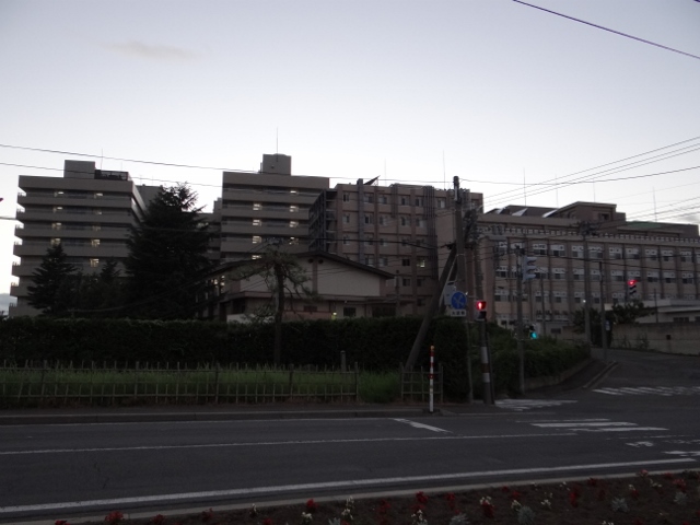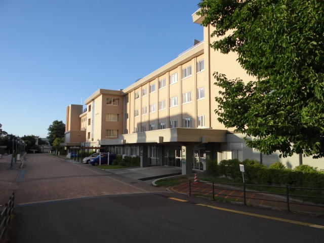 弘前大学医学部附属病院の正面。この構図では、小規模の病院にしか見えないかもしれない。だが実は、本院は斜面に立地しており、写真の向こう側の標高が、かなり下がっている。そのため、後方から見ると それなりの規模になる。