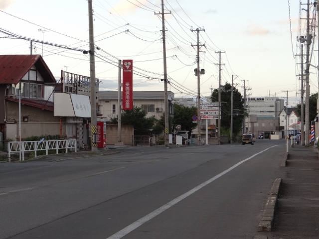 同じ交差点から、駅方面を見る。突き当りに 小さく見える 白いビルは、弘前パークホテル(旧 ホテル法華クラブ弘前)。