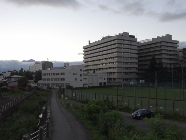 医学部地区全景。この時間、岩木山は全く見えない。左の三階建ては 生協会館。