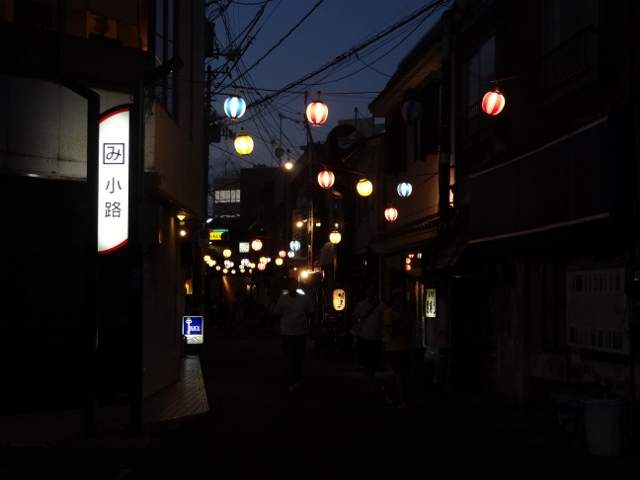 かくみ小路、19時00分。四角に み の字の ランプと ちょうちんがいい。